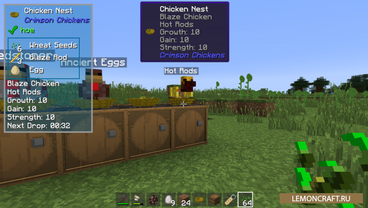 Мод на ресурсных куриц Crimson Chickens добавляет в игру специальные насесты и куриц, которые будут нести различные ресурсы. Есть два варианта завести себе ресурсную курицу, можно найти ее в вашем мире, приручить, начать разводить, а можно просто накормить простую курицу нужным вам ресурсом.